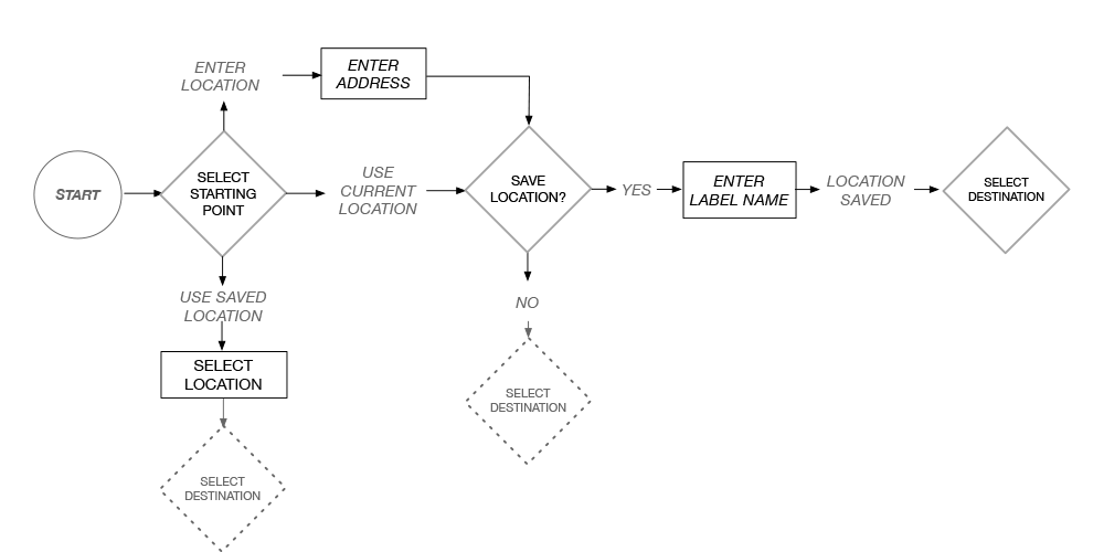 Task flow for selecting starting point. Selecting destination offers the same "Enter New/Use Saved" options. Once destination has been entered the "Let's Ride!" (Go) button is enabled.